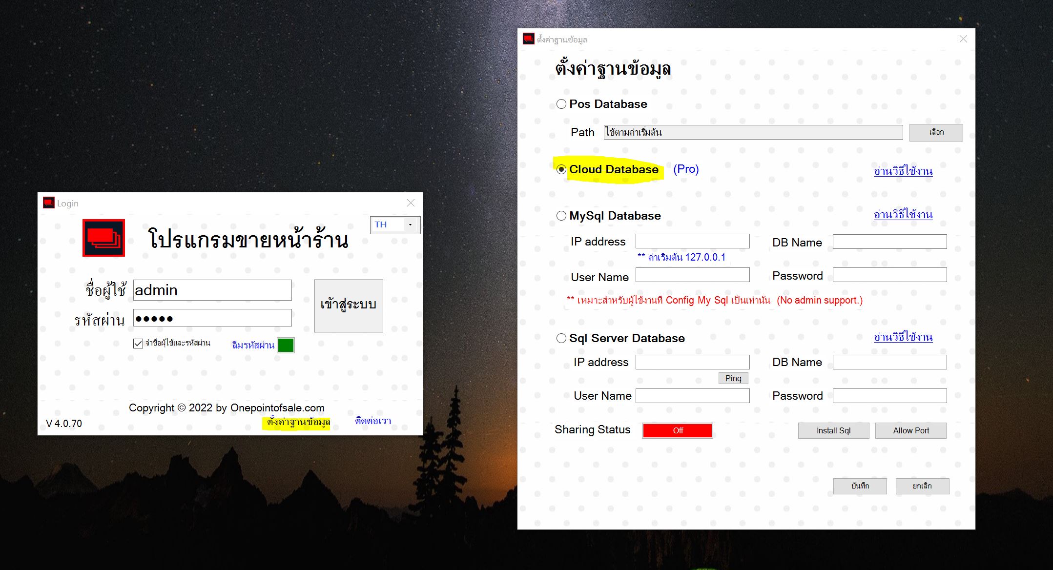 สามารถไปที่หมวดตั้งค่าฐานข้อมูลและเลือก Cloud Database (หากต้องการใช้งานติดต่อแอดมิน