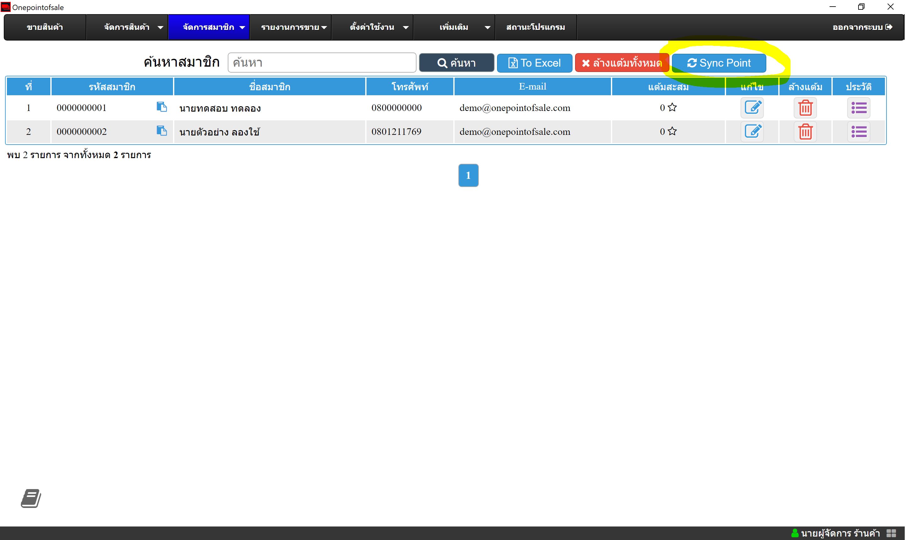 หากเปิดใช้งานเรียบร้อยแล้วที่เมนู แต้มสมาชิก จะมีปุ่มสำหรับการ Sync point จะเป็นการดึงข้อมูลแต้มสมาชิกจากคลาวด์ลงมาเพื่อดูภาพรวมของแต้มสมาชิก