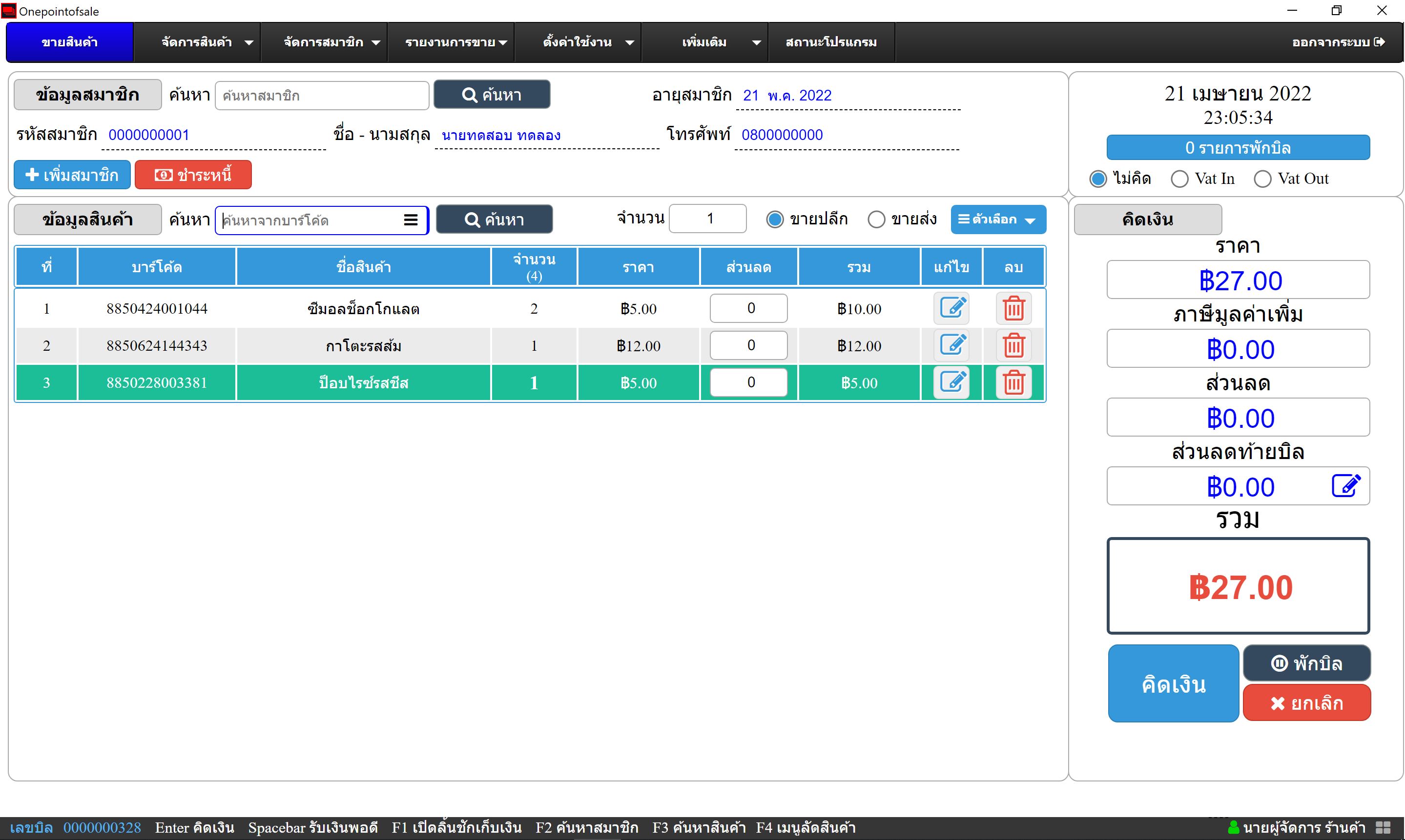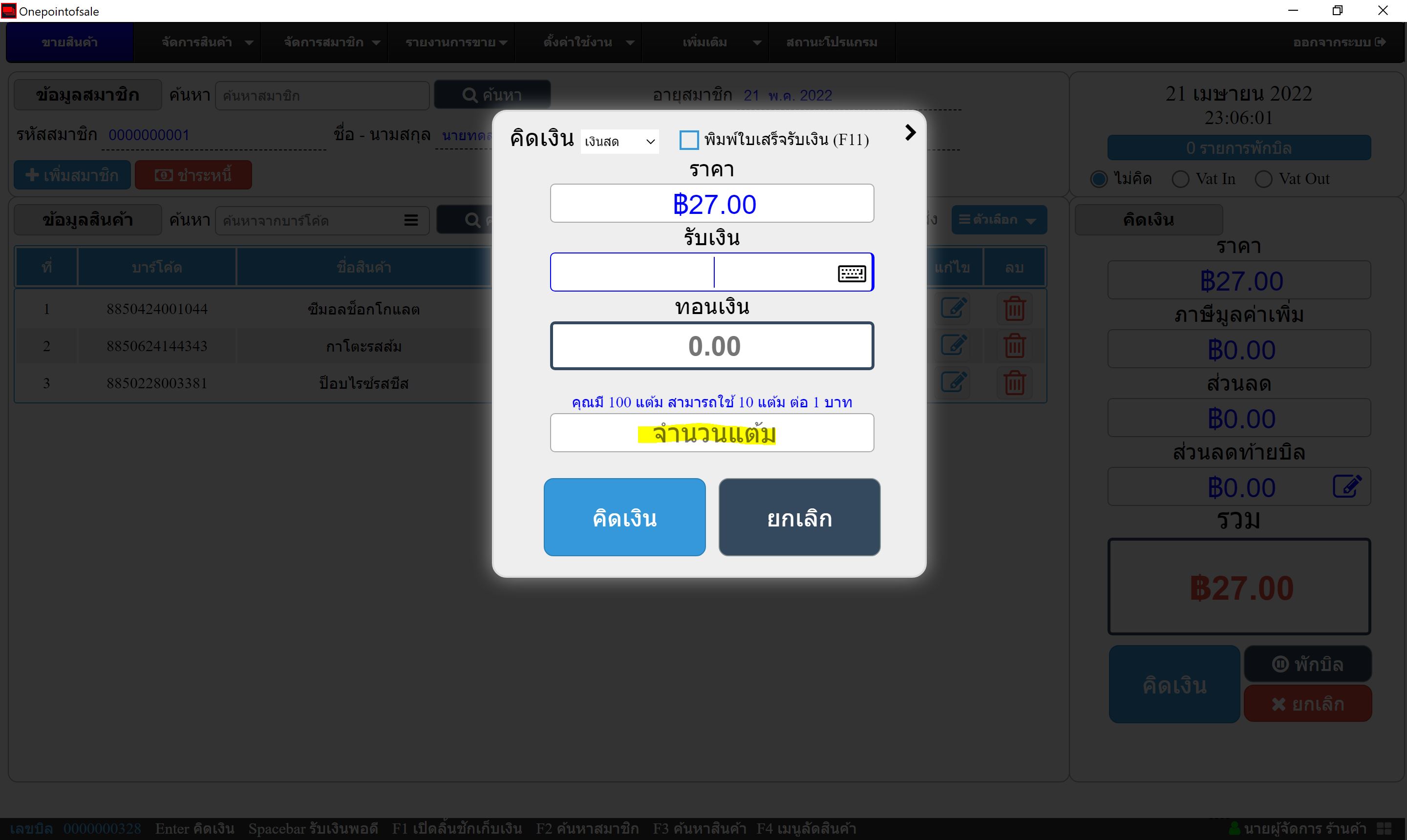 ทำการคิดเงินและสามารถใช้งานแต้มสมาชิกได้โดยจะเป็นจำนวนแต้มสะสมล่าสุดจากระบบคลาวด์