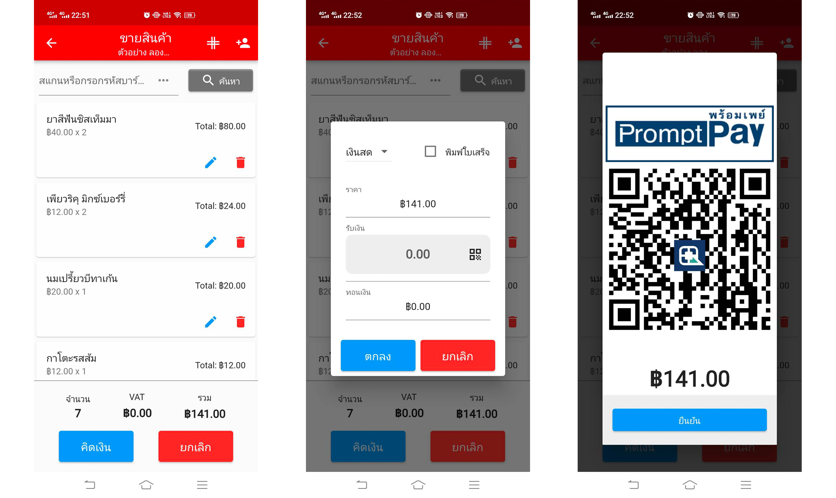 จะต้องทำการเชื่อมต่อ WIFI หรือวงแลนเดียวกับเครื่องที่ใช้งานโปรแกรมขายหน้าร้าน สามารถเลือกรายการสินค้าเข้ามาขาย และทำการคิดเงินโดย Application สามารถสร้าง QR code สำหรับการรับเงินตามจำนวนยอด (ตั้งค่าบัญชี Promptpay ที่โปรแกรมขายหน้าร้าน)