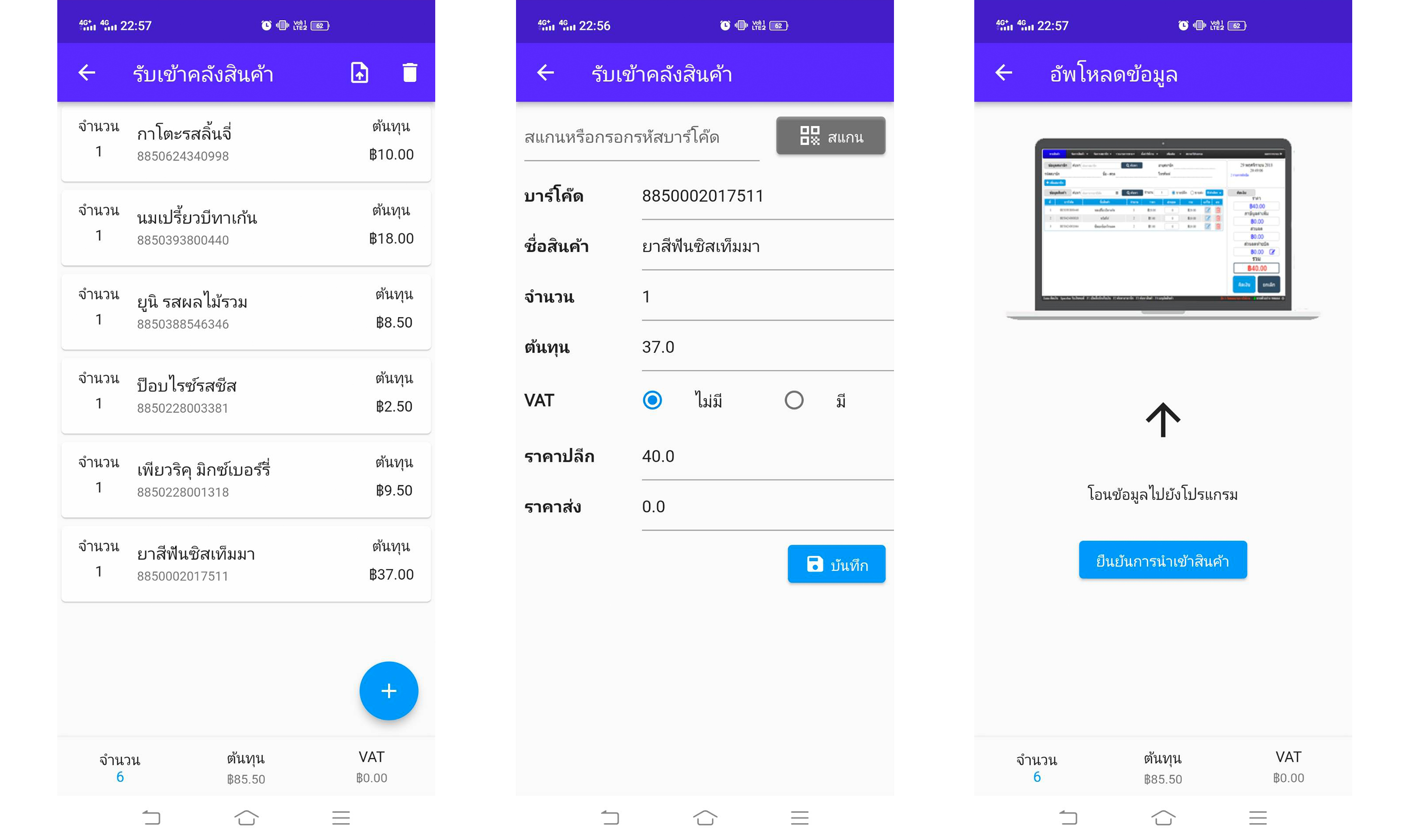 สามารถทำการรับเข้าผ่าน Application ได้โดนการสแกนสินค้าและกรอกจำนวน ต้นทุนสินค้า และสามารถส่งข้อมูลนำเข้าสินค้าไปยังตัวโปรแกรมขายหน้าร้าน
