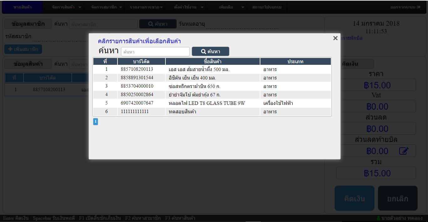 สำหรับท่านที่ไม่มีเครื่องอ่านบาร์โค้ด สามารถใช้ขายสินค้าได้เช่นกัน โดยให้กดปุ่มค้นหาที่อยู่ใกล้กับ ช่องค้นหาจากบาร์โค้ด จะได้หน้าจอดังภาพตัวอย่างด้านล่าง สามารถค้นหาสินค้าจากชื่อสินค้า รหัส เมื่อเจอสินค้าสามารถคลิกที่ชื่อสินค้า เพื่อทำรายการเพิ่มสินค้าสำหรับขาย