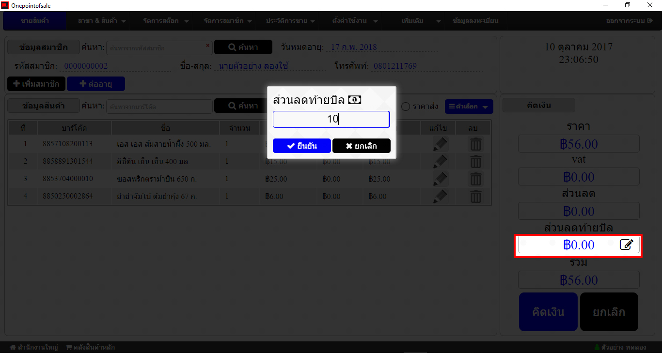 การเพิ่มส่วนลดท้ายบิลสำหรับรายการขาย สามารถทำได้โดยกดปุ่มที่ช่องส่วนลดท้ายบิล จะได้หน้าต่างเพิ่มส่วนลดท้ายบิลดังภาพด้านล่าง เมื่อกรอกส่วนลดเสร็จให้กดปุ่มยืนยัน (หรือ กดปุ่ม Enter ) เพื่อเสร็จสินการเพิ่มส่วนลด