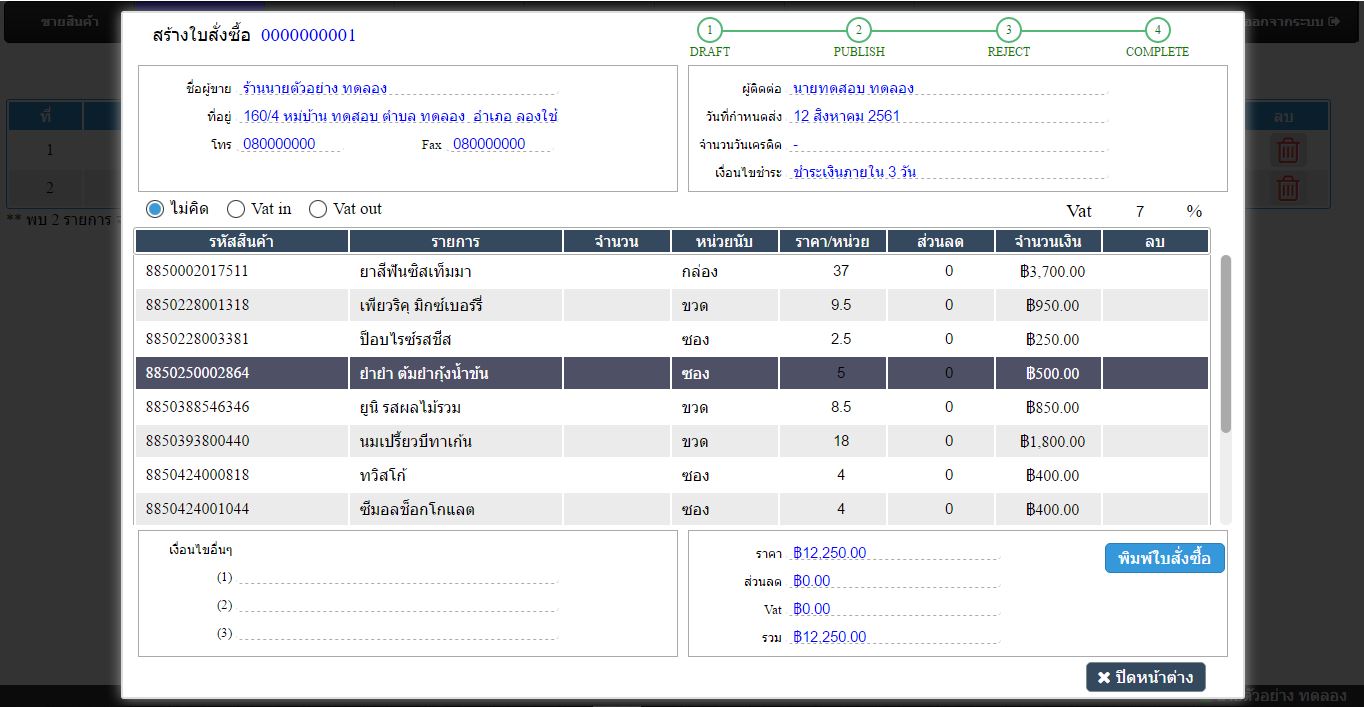 เมื่อสร้างใบสั่งซื้อสำเร็จและอยู่ในสถานะ Publish และเมื่ออัพเดทสถานะ เป็น Complete โปรแกรมจะนำเข้าจำนวนสินค้าอัตโนมัติและสามารถเข้าไปแก้ไขรายการนำเข้าที่เมนูการนำเข้ารายการสินค้า