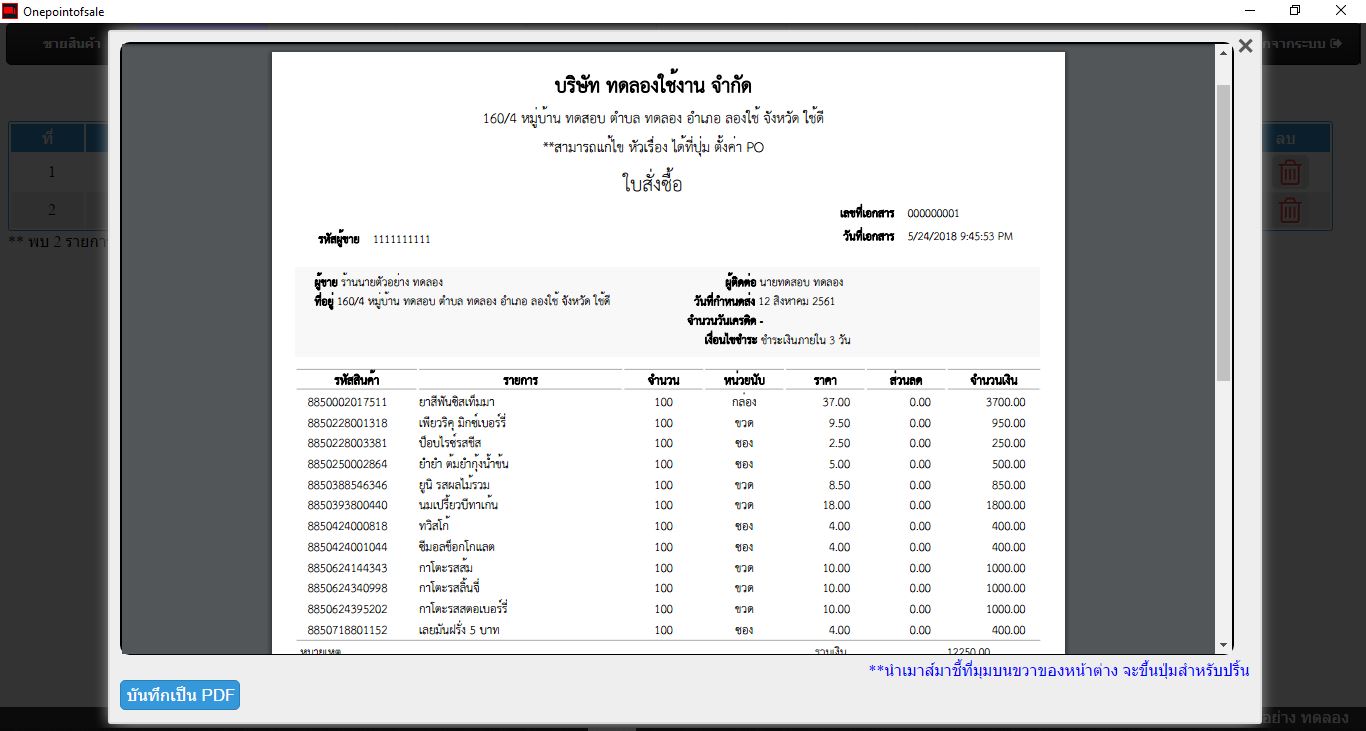 สามารถพิมพ์ใบสั่งซื้อได้ที่ปุ่ม พิมพ์ใบสั่งซื้อ โดยโปรแกรมจะแสดงภาพตัวอย่างของใบสั่งซื้อสินค้าที่กำลังสร้างอยู่
